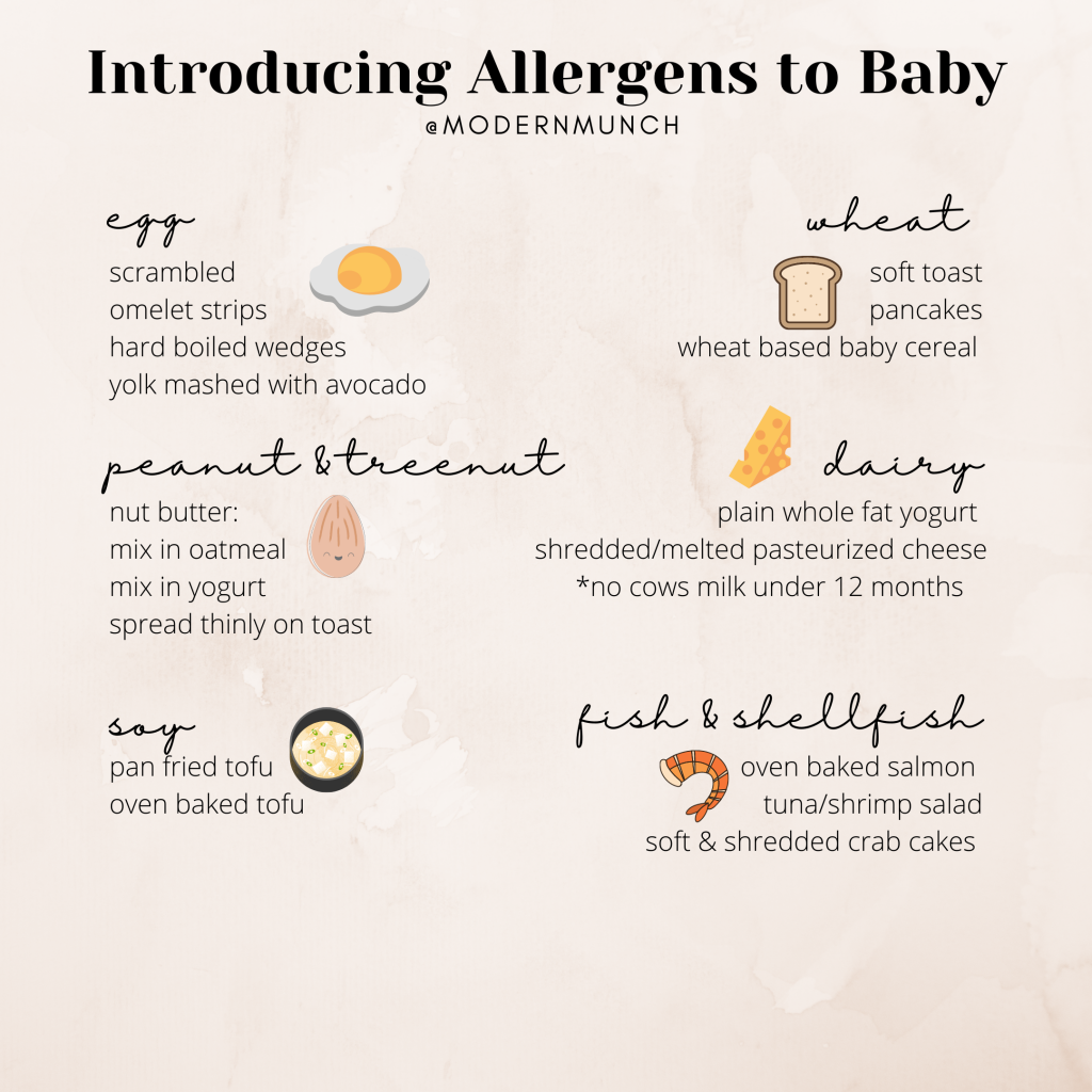 Allergies…scary, right? Just another worry to add on top of the already worried mama. Here is some good news, recent research has shown that the early introduction of the top food allergens can reduce the possibility of a life long food allergy. New recommendations are to start introducing these allergens at around 6 months of age when your baby starts solids, and continue to feed them often.