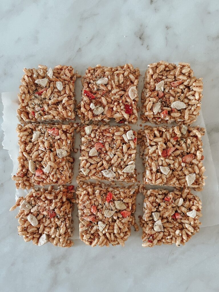 These are basically just healthy rice krispie treats but they are packed with healthy fats and protein without the nasty ingredients so you can feel good about serving them. The full recipe is in my toddler feeding guide which you can find here: MODERN TODDLER FEEDING GUIDE