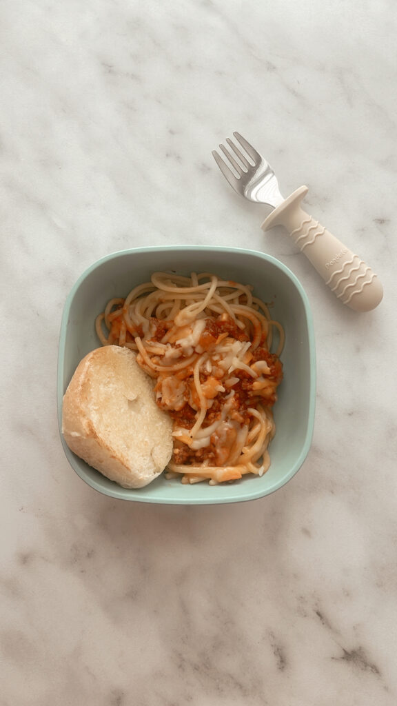 Something I love doing as a mom who is with her kids 99% of the day is using leftovers for lunch. We warmed our leftover spaghetti bolognese twice this week for a quick and easy lunch. I have lots of nutrient dense pasta recipes in the Toddler Feeding Guide (link here).