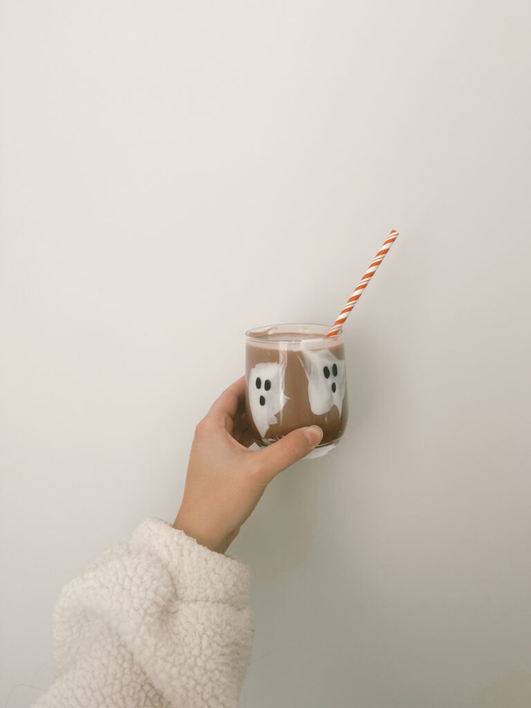 In the spirit of October, I am trying to make one fun snack for the boys each week that is Halloween themed. I made them “ghost milk” using our toddler milk and a little cocao powder to make it chocolate flavoured. Then I smeared some greek yogurt on the inside of the cup to make “ghosts” and used a dry erase marker to make the cute faces on the outside! The boys LOVED this.